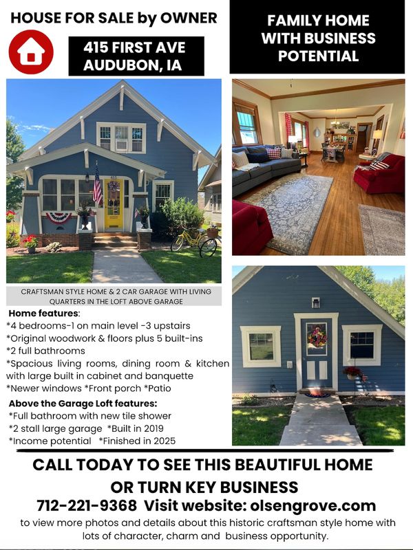 Bittersweet NEWS: We have decided to sell the Cozy Craftsman Cottage to pursue other opportunities closer to home. If you are interested and are a serious buyer in the market for a wonderful family home with income potential, please give us a call today to schedule a showing of the Cottage and the newly renovated Loft above the 2 stall garage. 712-221-9368